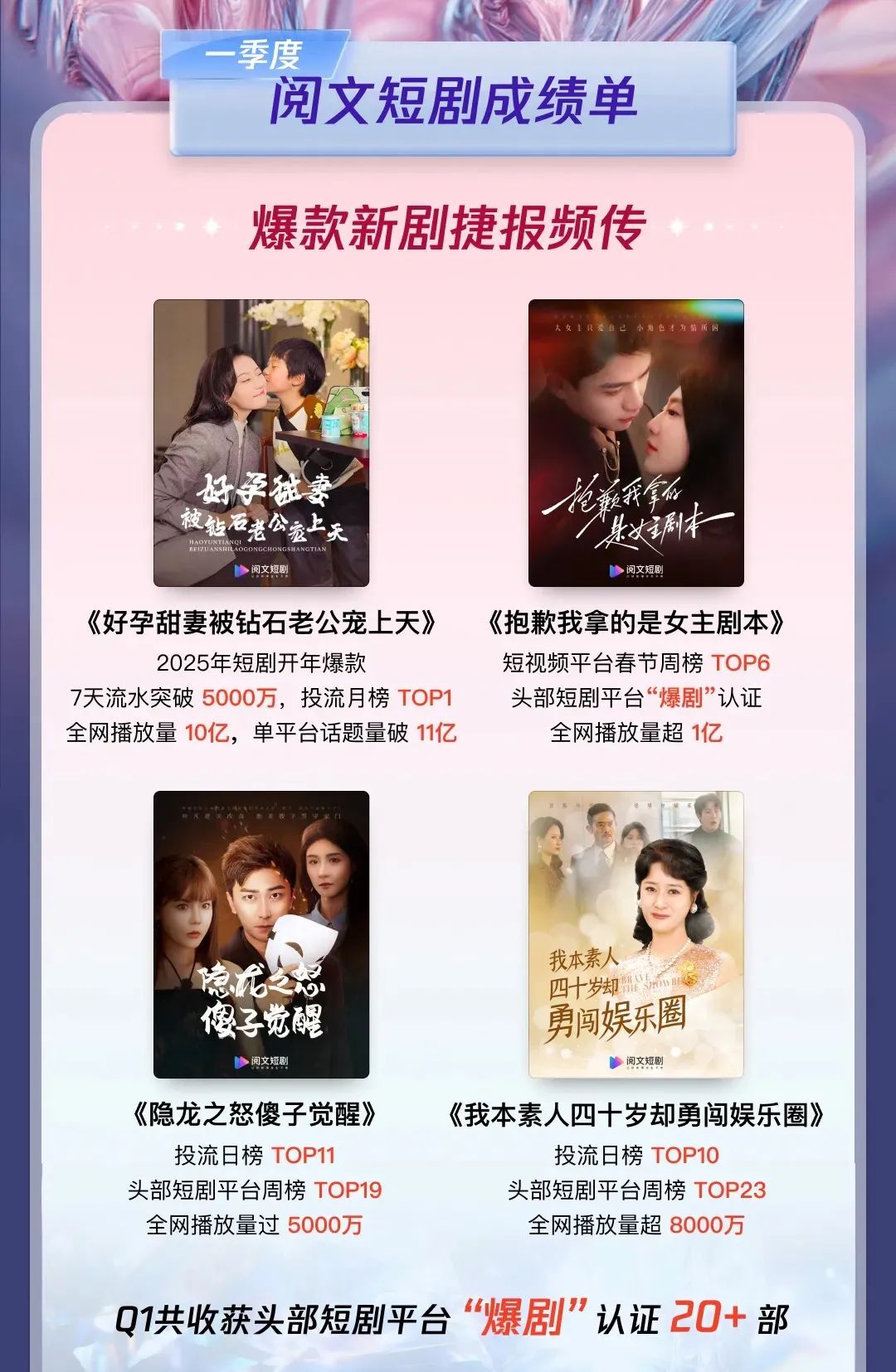 进入2025年,网文平台继续大卷特卷。2023年底入局短剧的老牌付费巨头阅文已推出“阅文短剧”小程序,2024年共上线100多部短剧作品。2025年1月的《好孕甜妻被钻石老公宠上天》7天流水突破5000w,跻身开年爆款。