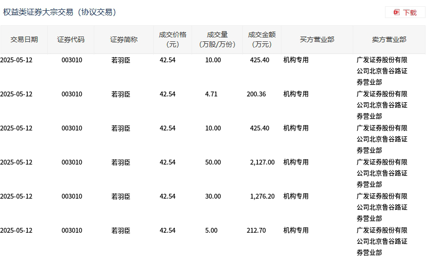 5月12日,若羽臣大宗交易成交109.71万股,成交额4667.06万元,占当日总成交额的17.36%,成交价42.54元,较市场收盘价48.03元折价11.43%。