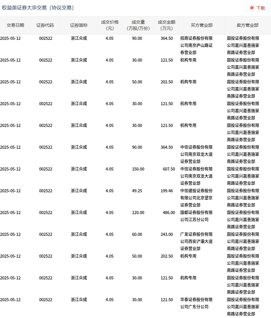 5月12日,浙江众成大宗交易成交809.25万股,成交额3277.46万元,占当日总成交额的24.58%,成交价4.05元,较市场收盘价4.62元折价12.34%。