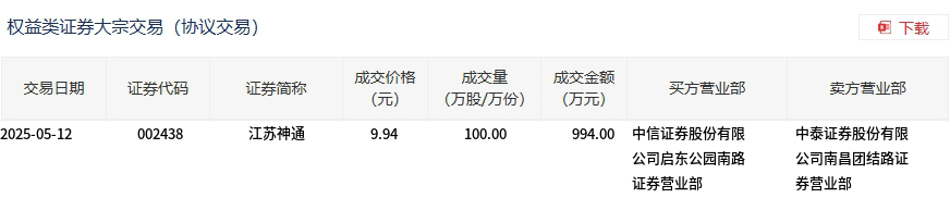 5月12日,江苏神通大宗交易成交100万股,成交额994万元,占当日总成交额的12.6%,成交价9.94元,较市场收盘价11.17元折价11.01%。