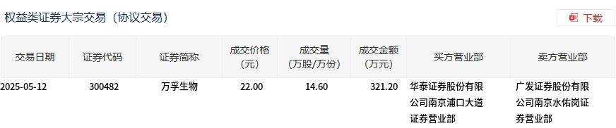 5月12日,万孚生物大宗交易成交14.6万股,成交额321.2万元,占当日总成交额的1.81%,成交价22元,较市场收盘价21.7元溢价1.38%。
