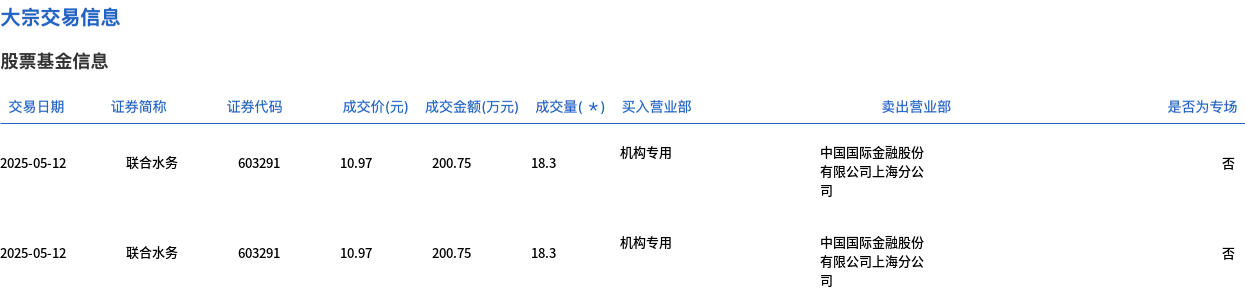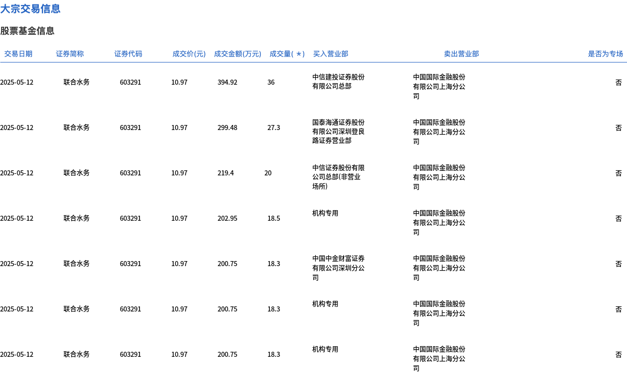5月12日,联合水务大宗交易成交193.3万股,成交额2120.5万元,占当日总成交额的10.35%,成交价10.97元,较市场收盘价12.71元折价13.69%。