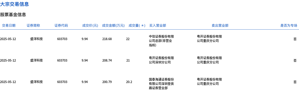 5月12日,盛洋科技大宗交易成交63.2万股,成交额628.21万元,占当日总成交额的11.52%,成交价9.94元,较市场收盘价10.96元折价9.31%。
