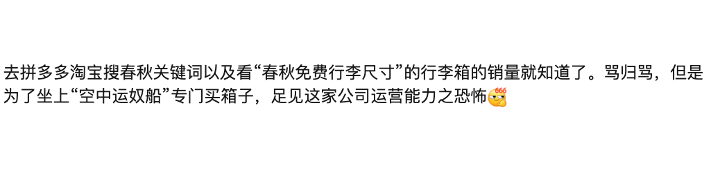 不过,与漂亮财报数据形成对比的是,网友们在社交媒体中对它疯狂吐槽——机龄太大、机舱有异味、座椅太挤、3个小时的飞行时间要被推销2个半小时的货、托运费贵过机票……