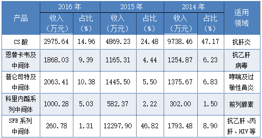 从具体的产品来看,奥翔药业主打五种产品,但整体市场占有率低,产品梯队的相对单一也使得单个产品对收入结构的影响较大。用于合成抗肝炎药物的重要中间体CS酸是公司收入的主要产品,但其近三年产销量持续下降,2014年该产品实现收入0.97亿元,接近该年公司营收的一半,2016年大幅下降至0.30亿元,但依然是对公司业绩贡献最大的产品,这也证明了其他产品的增长能力不强。此外,用于抗乙肝、丙肝和HIV等抗病毒药物的SFB系列中间体产品价格则出现了大幅下降,从2014年相对高位的价格到2016年下降近九成,这也使得该产品去年收入大幅同比下降近98%,对公司的收入贡献猛降45个百分点。