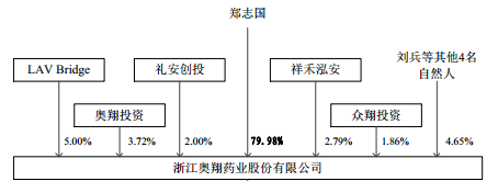 值得注意的是,在奥翔药业股东层面,现任公司董事长兼总经理郑志国为公司控股股东、实际控制人,本次发行前直接持有奥翔药业79.98%的股权。本次公开发行4000万股后,其股权比例将降至59.99%,仍处于绝对控股地位。此外,公司股东之间还存在关联关系。郑仕兰是公司股东奥翔投资、众翔投资的执行事务合伙人,分别持有奥翔投资、众翔投资60.63%、68.28%的出资比例,郑月娥与曾春元分别持有奥翔投资1.19%、2.99%的出资比例,而郑志国与郑仕兰、郑月娥为兄妹关系,曾春元与郑月娥是夫妻关系。