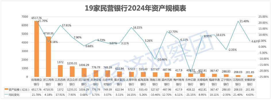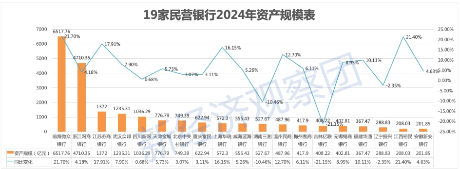 从增长幅度来看,19家民营银行中16家实现了正增长,仅振兴银行、三湘银行和亿联银行资产规模缩水。