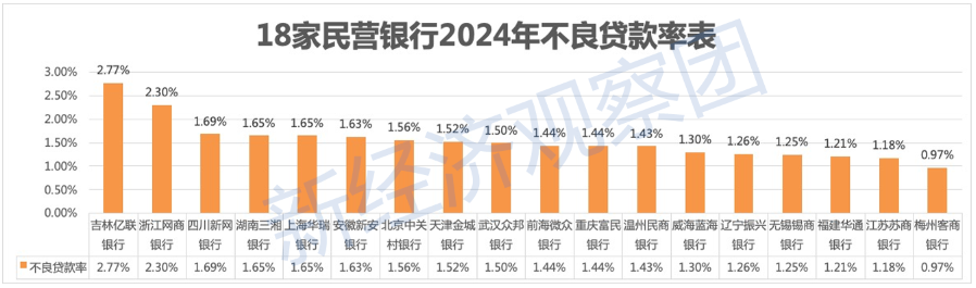 在2024年的财务报告中,民营银行的不良贷款率整体保持相对健康水平,大部分未超过2%,仅两家超过2%。