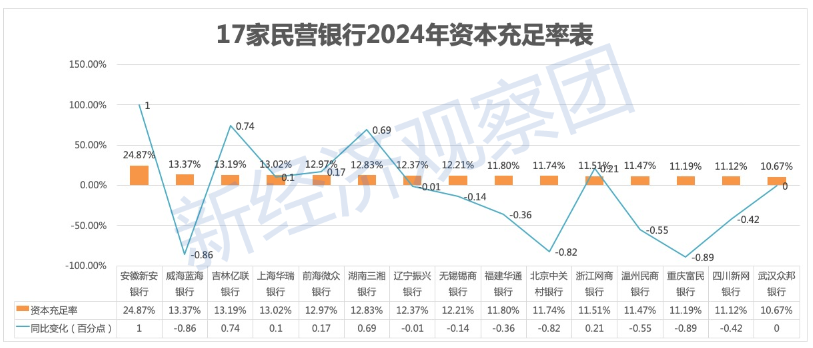 而在2024年,有7家民营银行的资本充足率低于12%,还有多家民营银行的资本充足率出现了下滑。
