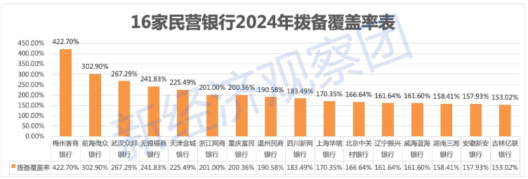 在拨备覆盖率方面,已公布数据的16家民营银行均满足了至少150%的监管要求,但不同银行之间的表现差异显著。其中,客商银行以高达422.7%的拨备覆盖率位居榜首,远超监管最低标准,展现了在应对潜在损失时的强大准备金基础。微众银行的拨备率超过了300%,众邦银行、锡商银行、金城银行、网商银行、富民银行均超过200%。