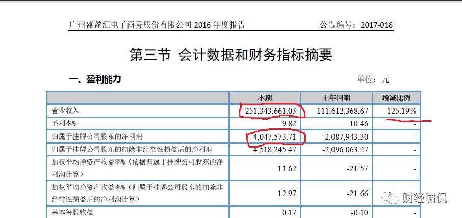 举个例子,2016年,深耕广州市场的垂直生鲜电商即盛盈汇实现营业收入2.51亿元,和2015年1.12亿元相比,增幅在125%左右;归属于挂牌公司股东的净利润接近405万元,成功扭亏为盈。