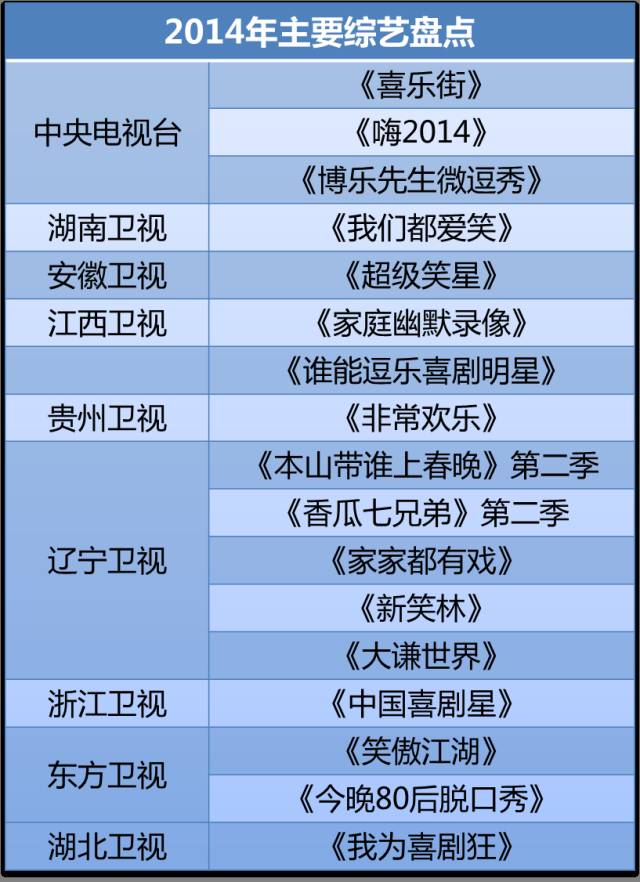 之所以2014年喜剧综艺能成为“喜剧元年”,其因有二。其一,广电总局政策影响。2013年10月,广电总局向各大卫视发出加强版“限娱令”,其中针对过于泛滥的歌唱选拔类节目,明确规定2014年全国卫视的歌唱类节目最多保留4档。因此各大卫视只能另寻出路,喜剧节目成为众多电视台眼中的“解围良方”。