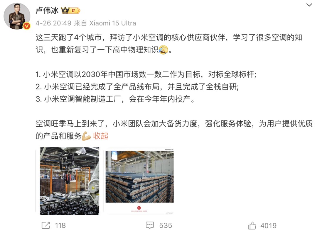 相比之下,雷军虽也是小米代言人,不过两者的流量路线有些不同。雷军很少参与娱乐性节目,更多的是善于通过放大公司和产品价值,以实现“技术+流量+营销”在商业上的闭环,比如小米汽车的造势营销便是很好的佐证。值得一提的是,小米近年也在空调领域发力,大有要拿下中国空调市场第一的士气。