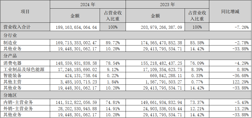 财报披露,2024年格力电器实现营业收入1891.6亿元,同比减少7.26%,未上2000亿大关,另外2家则均交出营收与净利润同增的业绩;“其他业务”收入比2023年减少近100亿元,减少幅度33.88%;消费电器去年收入1485.6亿元,同比减少4.29%。