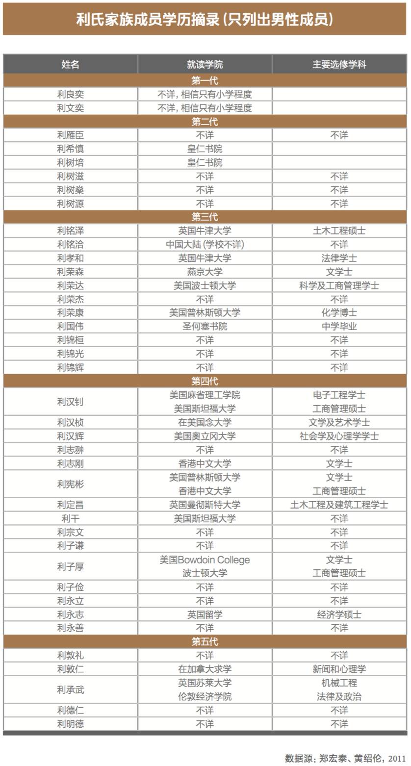 必须指出的是,那段休养生息的时期,不但令家族避过了危机,同时也让一众年纪较轻的子女们得以如期完成学业,提升了家族的人力资本。而年纪较长的子女,则可积累更多经验和资历,其中又以利铭泽和利孝和两兄弟可以完成训练与实习,获得工程与法律专业资格最为重要,此点尤其成为家族长远发展的重要资本与优势。