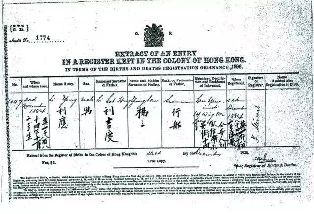 郑宏泰教授由英国档案馆取得的出生证明影印本,发现利希慎原名利应,出生证明连利家后人都未见过。