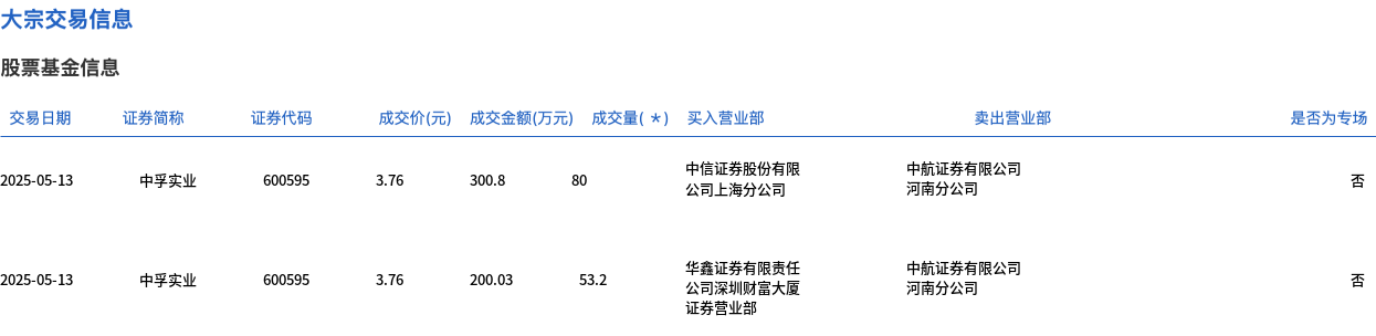 5月13日,中孚实业大宗交易成交133.2万股,成交额500.83万元,占当日总成交额的1.34%,成交价3.76元,较市场收盘价3.97元折价5.29%。
