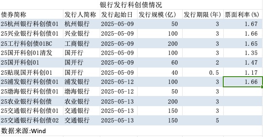 比如农业银行5月12披露的发债材料显示,拟发行农业银行2025年科技创新债券(债券通),基本发行规模为人民币100亿元,附不超过人民币100亿元超额增发权,债券期限为3年期,募资将用于发放科技贷款,专项支持科技创新领域业务。