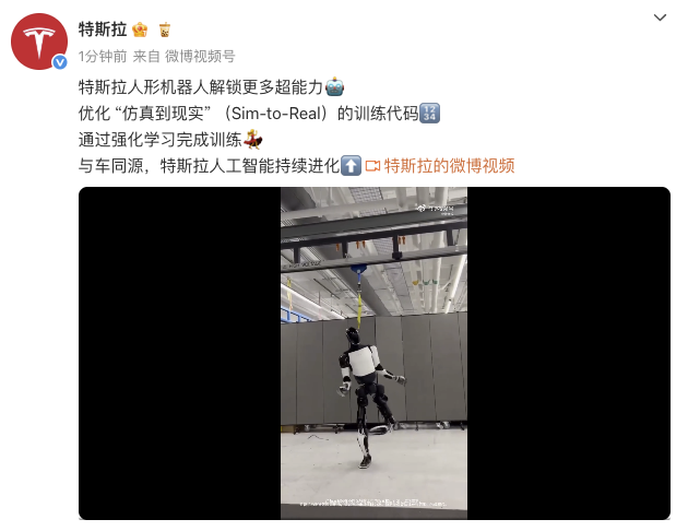 5月13日晚间,特斯拉官方微博发布人形机器人擎天柱(Optimus)“跳舞”视频,并表示其人形机器人优化“仿真到现实”(Sim-to-Real)的训练代码,通过强化学习完成训练。