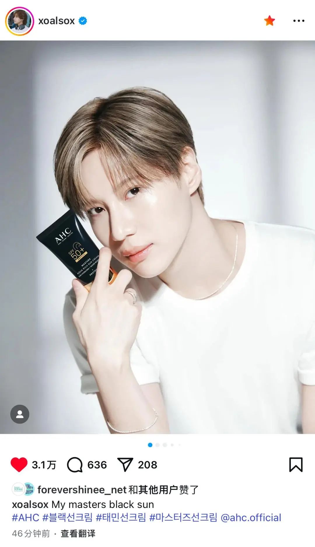 SHINee 成员李泰民在个人 ins 发布韩国品牌 AHC 广告图