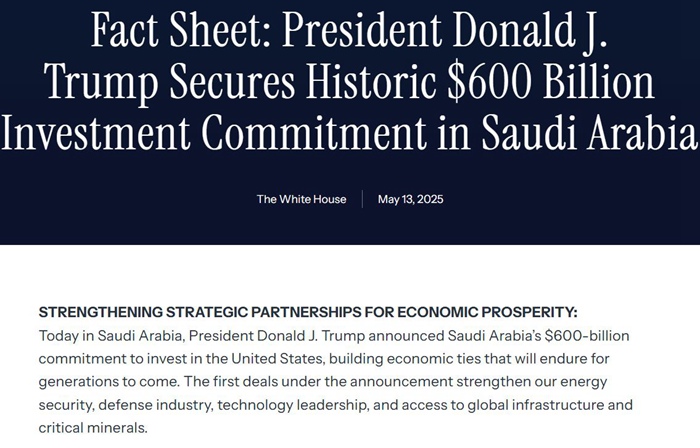 根据白宫介绍的6000亿美元投资情况,沙特的投资集中在能源安全、国防工业、科技、基建和关键矿产领域。