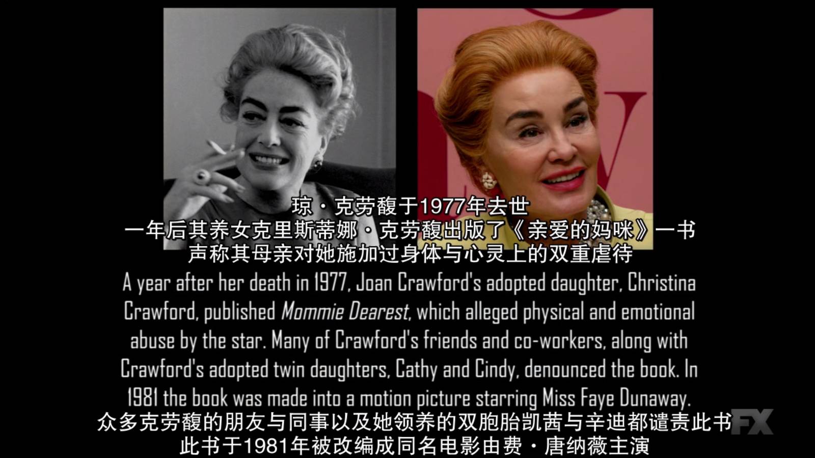 这本书就说尽了琼·克劳馥的坏话,为了维持她个人的明星光环,如何各种奴役她的养女,甚至在养女生病时,扮成养女的样子代替她演出电视剧。费·唐娜薇在脸型上,还是与琼·克劳馥有相似性,可是五官还是不太一致,就算浓妆艳抹了一番,还是很明显有差距。