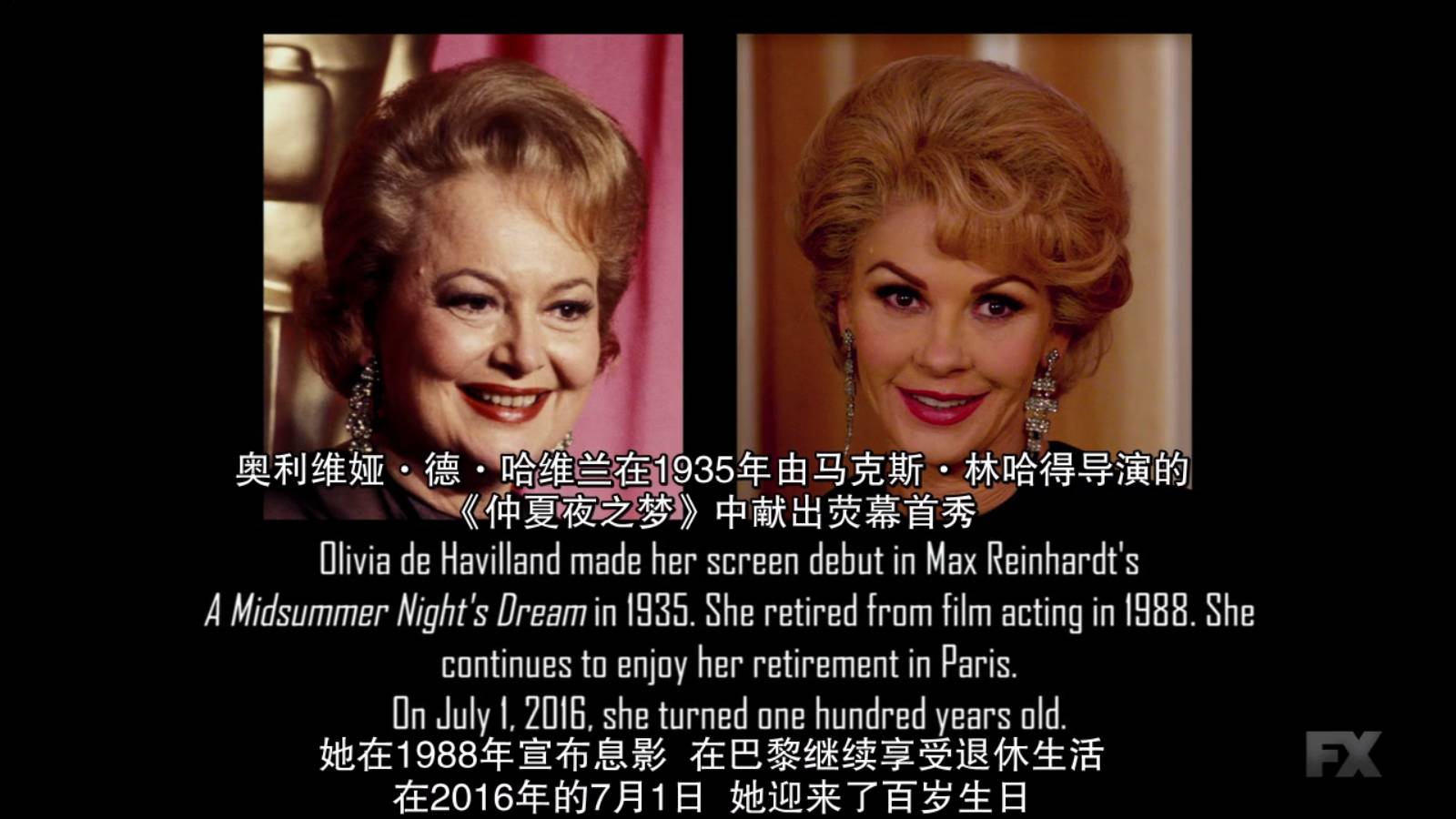 但是,明明剧中就涉及的奥利维拉·德哈维兰就有自己的撕逼史啊!在一起通电中,贝蒂·戴维斯明确的有一句台词:你那个琼可没我这个难搞!奥利维亚·德哈维兰和妹妹琼·芳登近百年的恩怨,也是很适合拍成一出狗血大剧的。就算琼·芳登在前几年去世了,百岁之时接受采访的奥利维亚·德哈维兰还是称她为龙夫人,就是英语俚语中蛇蝎女子的意思。