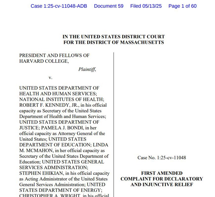 起诉书要求法官裁定联邦政府的行动非法,恢复对哈佛大学的所有拨款。马萨诸塞州联邦地区法院此前安排的首次出庭辩论日期为7月21日。
