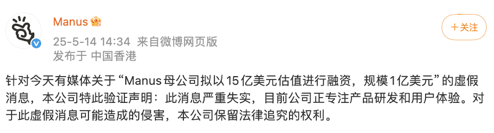 5月14日,Manus发文称,针对今天有媒体关于“Manus母公司拟以15亿美元估值进行融资,规模1亿美元”的虚假消息,公司特此验证声明:此消息严重失实,目前公司正专注产品研发和用户体验。对于此虚假消息可能造成的侵害,公司保留法律追究的权利。