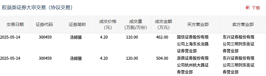 5月14日,汤姆猫大宗交易成交230万股,成交额966万元,占当日总成交额的1.41%,成交价4.2元,较市场收盘价5.24元折价19.85%。
