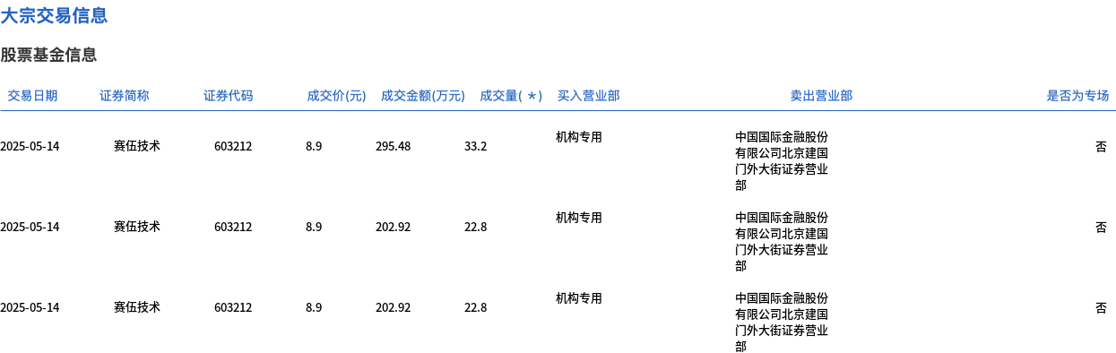 5月14日,赛伍技术大宗交易成交112万股,成交额996.8万元,占当日总成交额的13.28%,成交价8.9元,较市场收盘价9.84元折价9.55%。