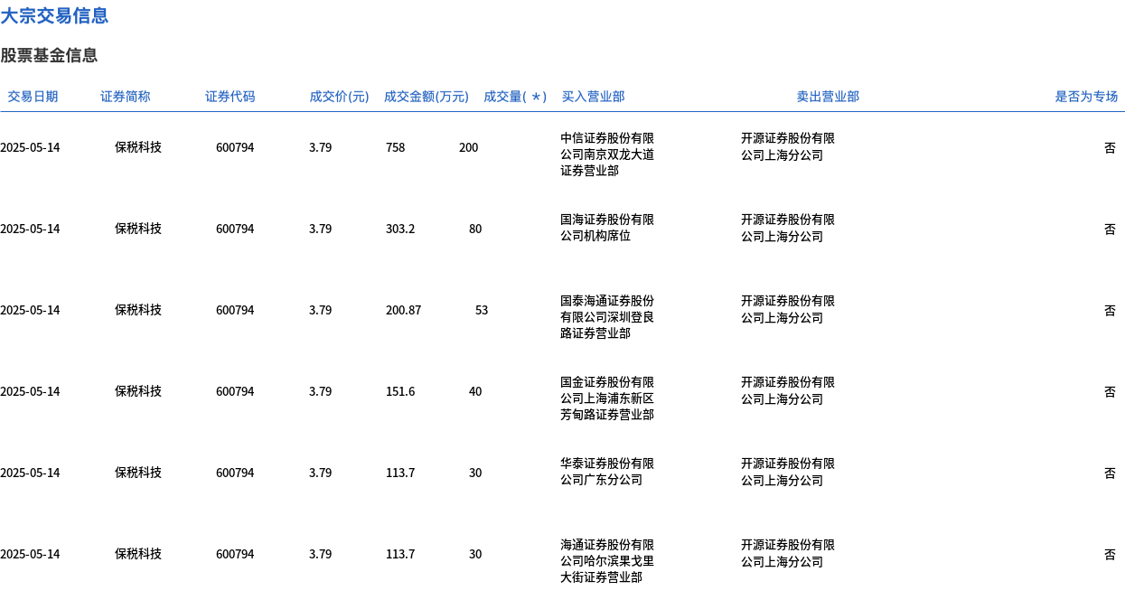 5月14日,保税科技大宗交易成交433万股,成交额1641.07万元,占当日总成交额的1.52%,成交价3.79元,较市场收盘价4.63元折价18.14%。