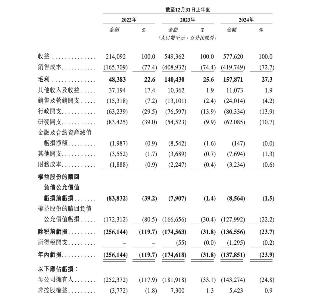 报告期内,泽景的总收入分别约2.14亿、5.49亿、5.78亿元;毛利分别约4838.3万、1.40亿、1.58亿元,毛利率分别为222.6%、25.6%、27.3%;净亏损分别约2.56亿、1.75亿、1.38亿元,三年累计亏损约5.69亿元;经调整净亏损分别约7913.2万、1331.3万、713.1万元。