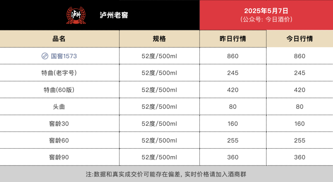 据“今日酒价”公众号数据显示,5月7日,52度500ml国窖1573价格为860元/瓶,低于930元/瓶的出厂价;52度500ml特曲(60版)价格为420元/瓶,而早在2023年,《关于调整60版特曲价格的通知》就已经将该酒型提价到了478元/瓶。