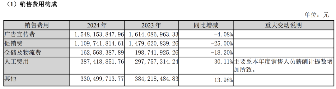 从2024年年报来看,泸州老窖销售费用压缩4个多亿。其中,广告宣传费15.48亿元,全年同比下降4.08%,而在上半年,则这一指标同比大增超30%;促销费11.1亿元,全年同比大降25%。