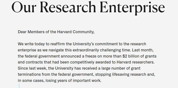 截至目前,联邦政府暂停拨款的行动没有导致哈佛大学的研究项目被关闭。但4月,该校医学院已经预警之后可能出现裁员和项目缩减。当月,哈佛大学公共卫生学院开始裁员,公共卫生学院是最依赖联邦拨款的学院。