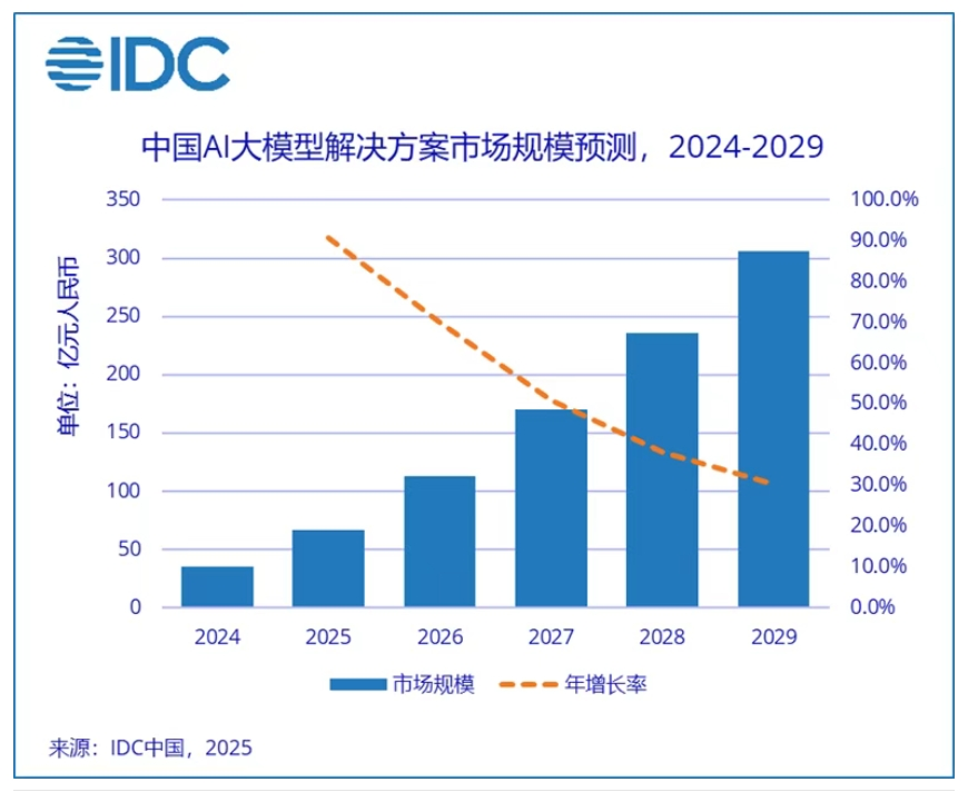 根据天眼查公开数据,及国际数据公司(IDC)最新发布的研究报告显示,2024-2029年中国模型即服务(MaaS)市场将以66.1%的年均复合增长率高速扩容,预计2029年市场规模将达到90亿元人民币。AI大模型解决方案市场同样保持高位增长态势,预计2029年整体规模达306亿元人民币。