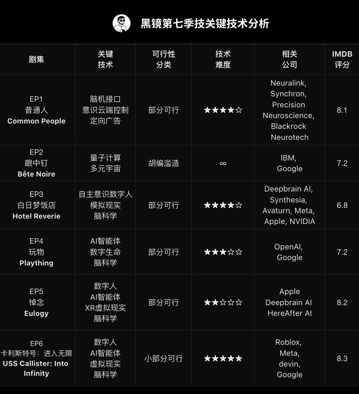 最后再总结一下,《黑镜》第七季的终于又回到正轨,因为这两年来AI的飞速发展,让我们终于有机会可以从现实技术的角度去讨论科幻剧,但不得不承认比特世界的进化速度远远高于原子世界,距离剧中绝大多数的科技设定,还依然很遥远。