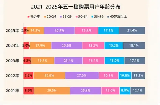 一来,“谷子经济”与年轻市场关联紧密,是年轻群体助推下兴起的新兴产业,而电影市场在阶段性回落的过程中,流失的消费群中也有不少年轻人。以刚过去的五一档为例,灯塔专业版出品的《2025五一档电影市场洞察报告》数据显示,今年五一档24岁以下观众占比为17%,这一数据呈现出明显的逐年递减的趋势。