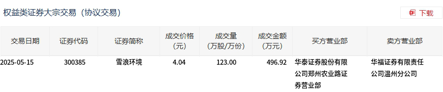 5月15日,雪浪环境大宗交易成交123万股,成交额496.92万元,占当日总成交额的15.46%,成交价4.04元,较市场收盘价4.94元折价18.22%。
