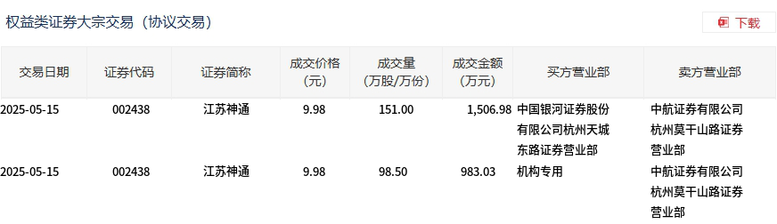 5月15日,江苏神通大宗交易成交249.5万股,成交额2490.01万元,占当日总成交额的31.39%,成交价9.98元,较市场收盘价10.93元折价8.69%。