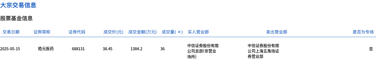 5月15日,皓元医药大宗交易成交36万股,成交额1384.2万元,占当日总成交额的11.21%,成交价38.45元,较市场收盘价39.04元折价1.51%。