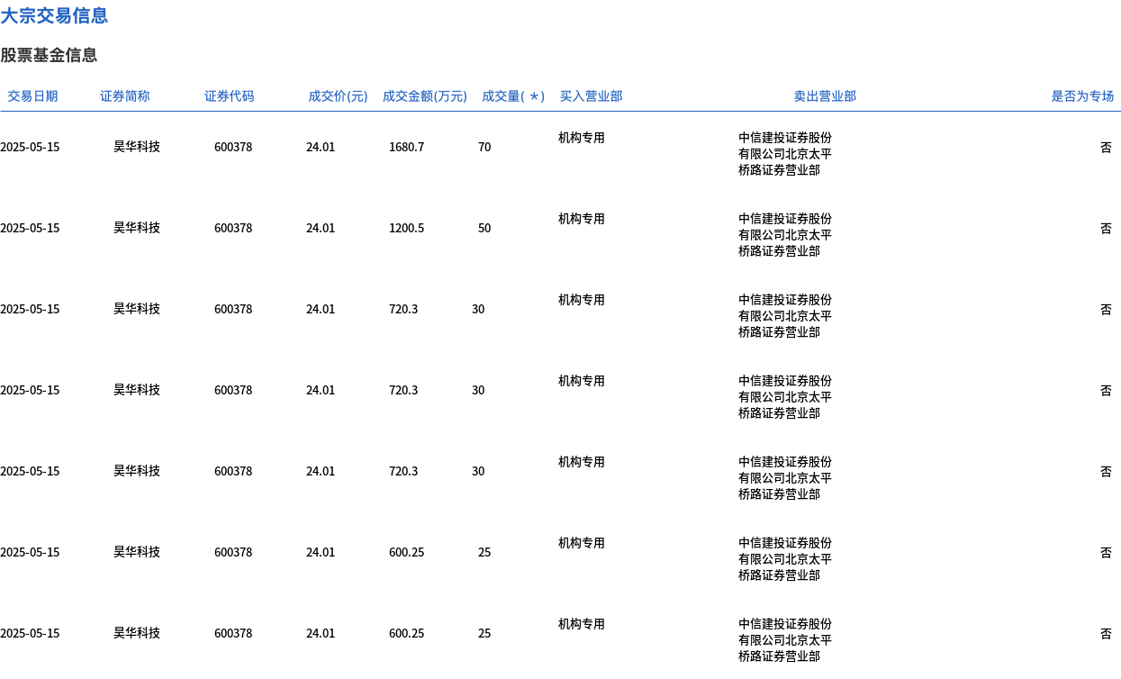 5月15日,昊华科技大宗交易成交260万股,成交额6242.6万元,占当日总成交额的55.51%,成交价24.01元,较市场收盘价25.82元折价7.01%。