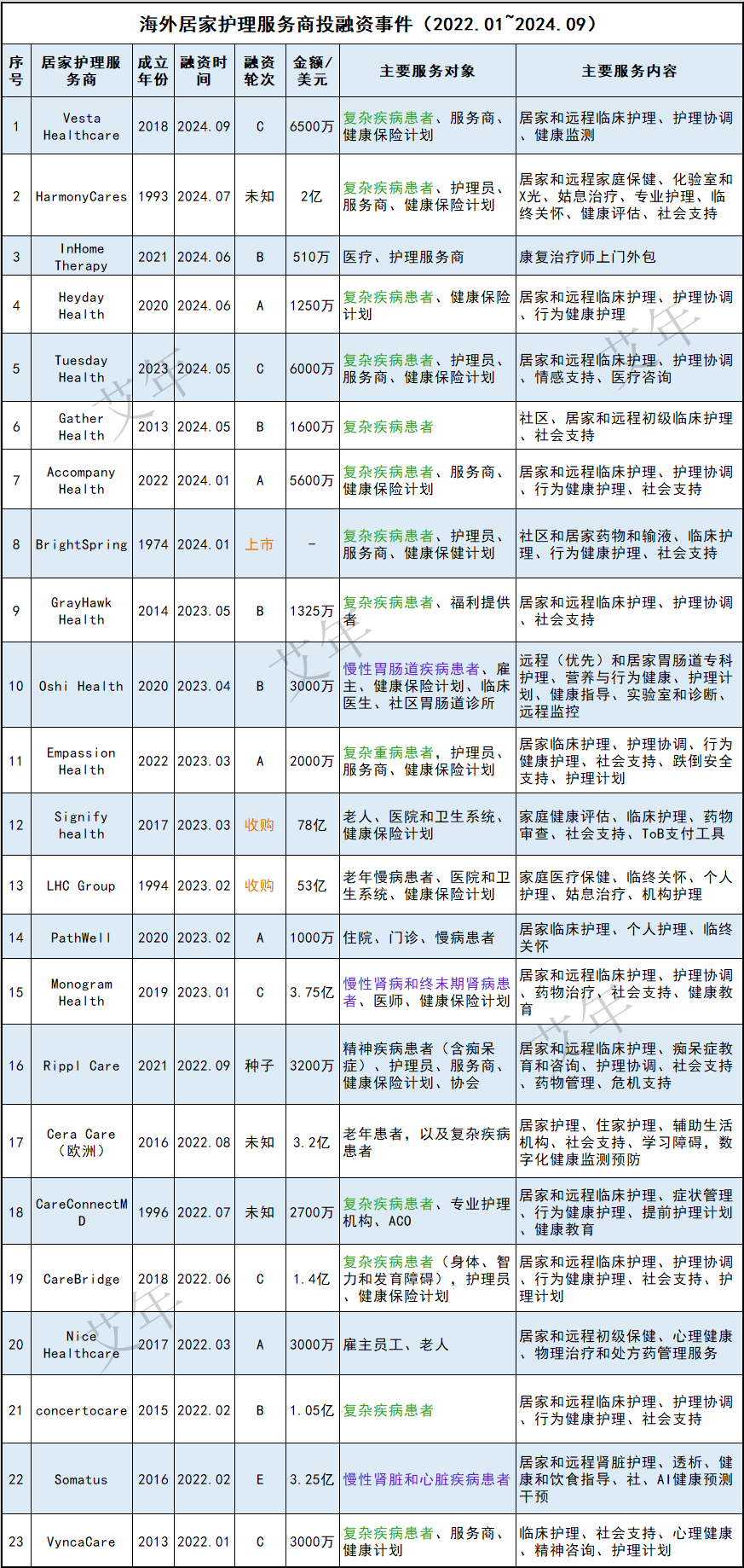 近期,笔者不完全统计了海外居家护理服务商的投融资事件,时间范围从2022年1月至今,融资金额大于500万美元,主要是美国企业。