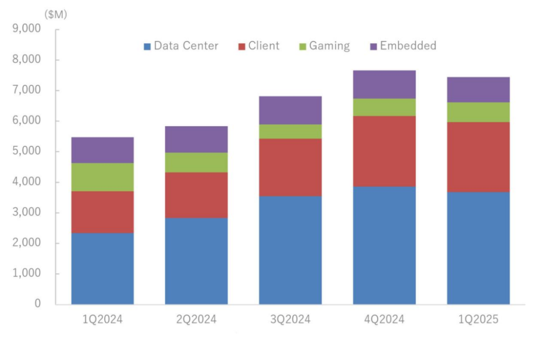 AMD 2025 年 1 月至 3 月季度的销售额预计将比去年同期增长 35.9%。这大致相当于市场增长率的逻辑。考虑到 AMD 的大部分销售额都来自微处理器,而不是逻辑处理器,而且根据 WSTS 的数据,2025 年 1 月至 3 月期间微处理器的市场增长率与去年同期相比仅为 4.1%,AMD 的表现将使其跻身“赢家”行列。