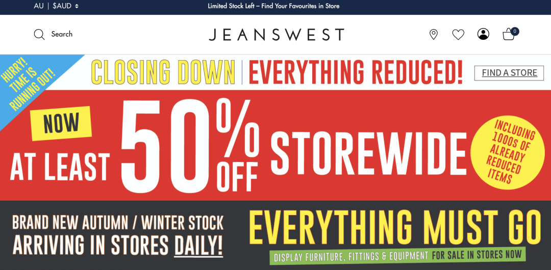 同时,公司希望在Jeanswest于澳大利亚的90家门店全部关闭之前,于5月20日前在线下门店完成价值2000万美元的品牌库存的销售。目前,Jeanswest官网渠道已暂停运营,并欢迎消费者前往线下门店参与大促。(华丽志)