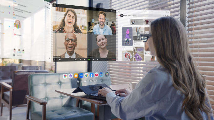 该AR眼镜可为用户提供134英寸的“空间屏幕”,显示界面的远近距离与画面尺寸均可调节,支持至多6屏的多窗口同台显示。