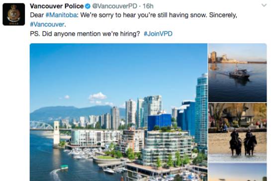 加拿大乐活网(lahoo.ca)获悉,一切都源自温哥华警局对曼尼托巴省温尼伯警局的一封挑衅推特:“亲爱的曼尼托巴:听说你们那里还在下雪,我们对此表示很遗憾。真挚的,温哥华。PS:我们在招人哦 #加入温哥华警局”。