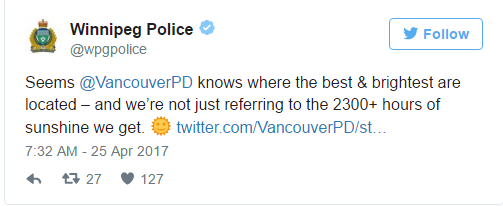 温哥华警局如此怪里怪气地一通推特,人家温尼伯当然也不是吃素的。温尼伯警局及时回复:“看起来好像温哥华警局知道什么地方有最好的阳光呢——我才没有说我们这里有超过2300小时的阳光哟。”