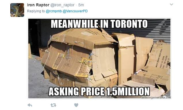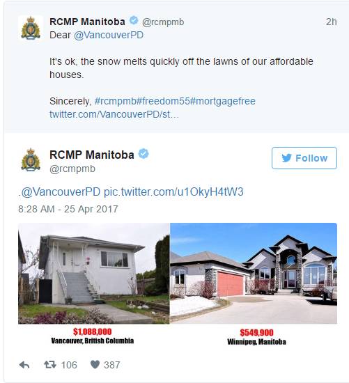 不仅如此,温尼伯警局还乘胜追击怼到:“亲爱的温哥华警局,没关系,我们这边的雪在可负担性房屋前的草坪上化得很快。”怼完这一局,温尼伯警局还顺势附上了一副温哥华和温尼伯房价对比图,看得加拿大乐活网(lahoo.ca)也是心里一紧。